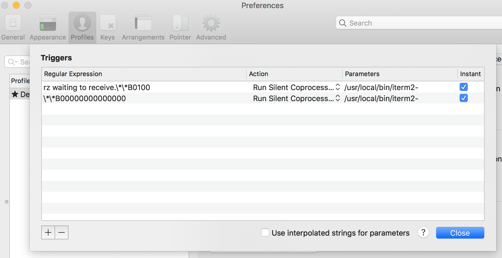 最后,配置iTerm2的触发器(点击菜单的Profiles,选择某个profile之后然后继续选择advanced → triggers,添加triggers),配置器触发如下: