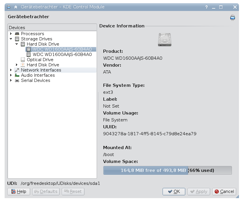如果你不善于使用shell,KDE-GUI工具也可以用来查找UUID:/usr/bin/kcmshell4 devinfo